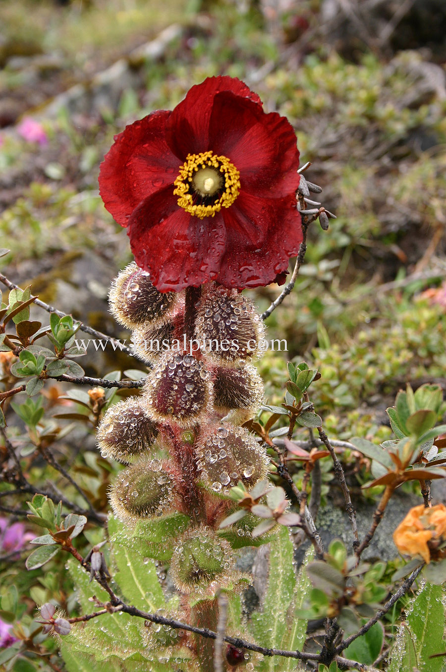 Habitat shot with some plants approaching 1 metre in height. Margaret Thorne - the photographer- took a series of detailed measurements of flowering and non flowering rosettes as well as details of numbers of seed pods. This sort of data is invaluable since herbarium specimens are always scarce and collecting them should only be done by serious botanists with permission but archives of photographs and measurements will be become an increasingly important taxonomic tool. This data can be stored by the Meconopsis group in Edinburgh. |